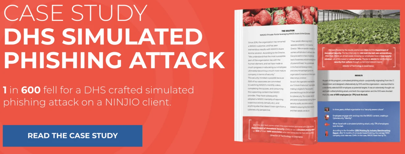 To test the effectiveness of NINJIO’s training and evaluate the overall security IQ among employees, the client worked with the DHS to launch a simulated phishing attack on 600 random employees. The results were a testament to the power of engaging, compelling security awareness content in changing behavior: 599 out of 600 passed. In other words, only ONE person took the bait.